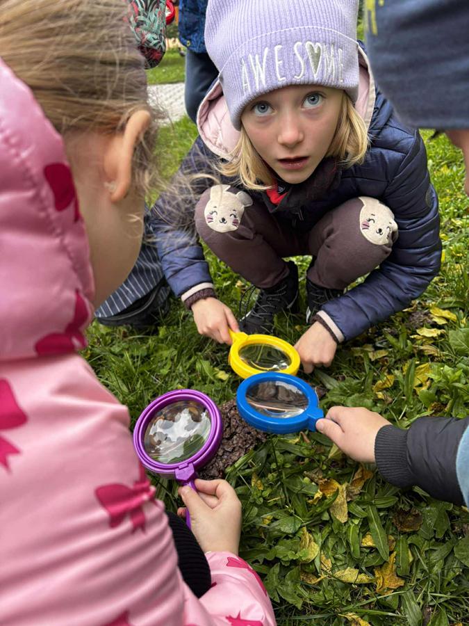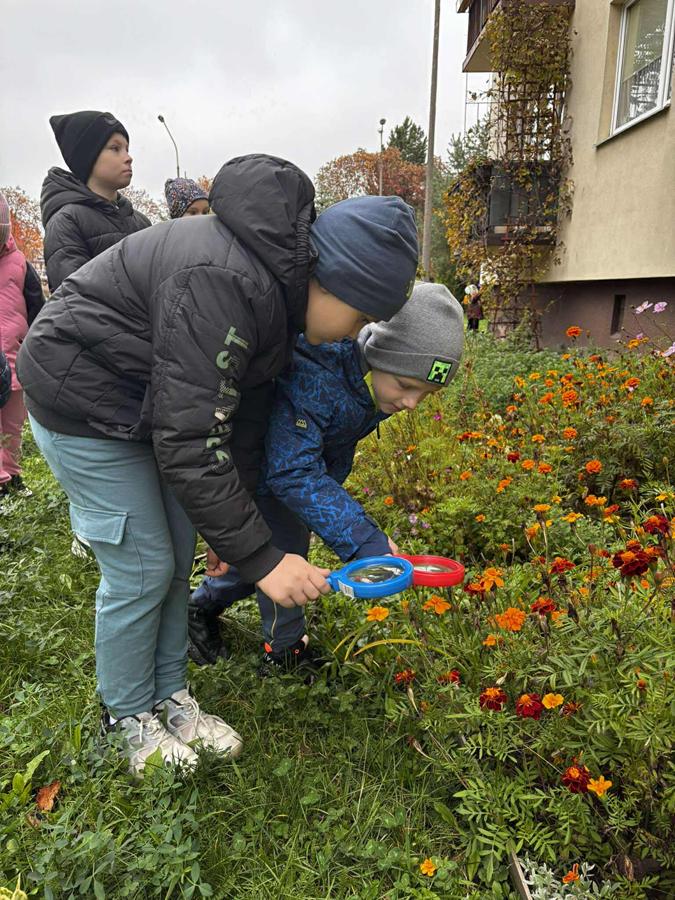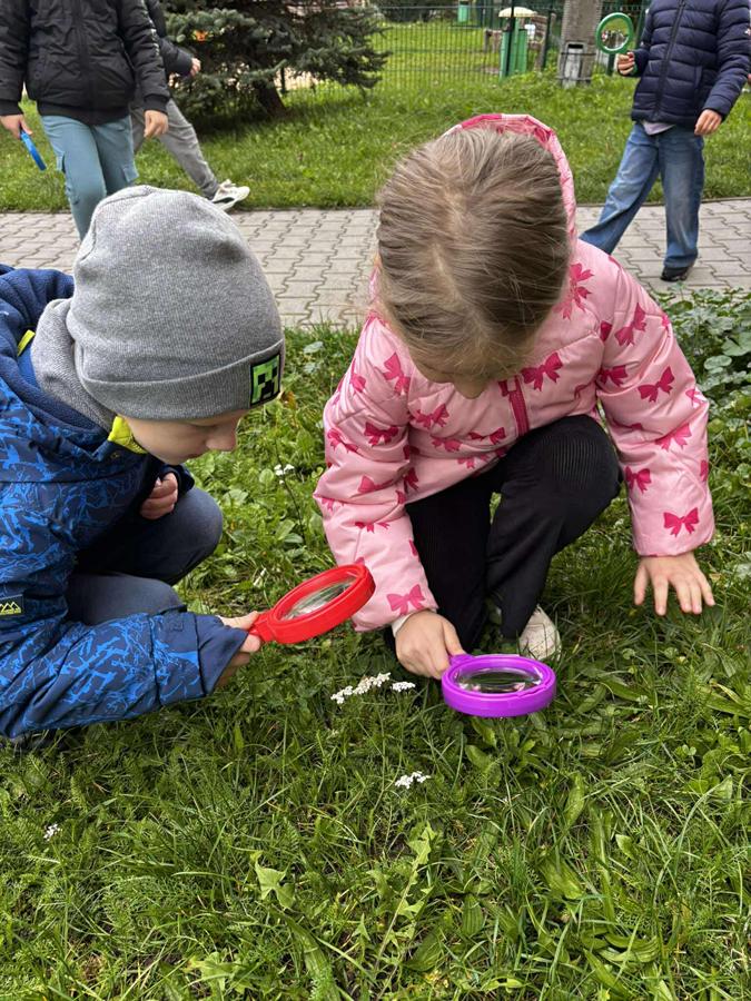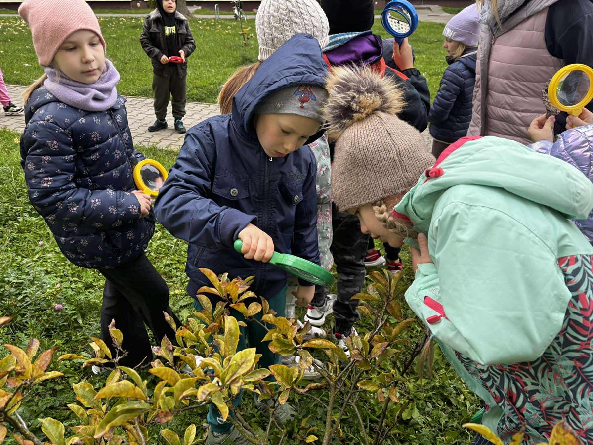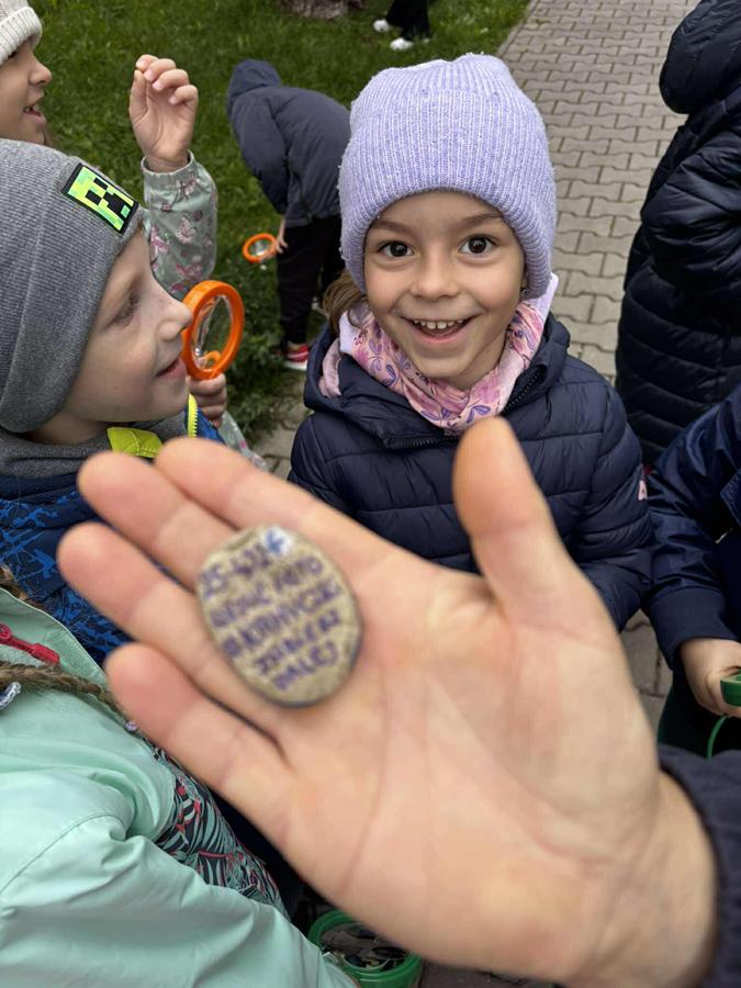 Uczniowie klasy I A wybrali się na zajęcia terenowe, podczas których prowadzili obserwacje przyrodnicze z wykorzystaniem lup. Dzieci z dużym zainteresowaniem przyglądały się roślinom, owadom i innym elementom otaczającej przyrody. Dzięki lupom mogły dostrzec wiele szczegółów, których na co dzień nie widać gołym okiem. Podczas wspólnej wyprawy uczniowie dokonali także ciekawego odkrycia – znaleźli wyjątkowy kamień w podróży, który wzbudził ich ogromną ciekawość. Stał się on pretekstem do rozmowy o tym, jak różnorodna i fascynująca potrafi być natura.