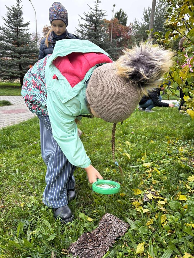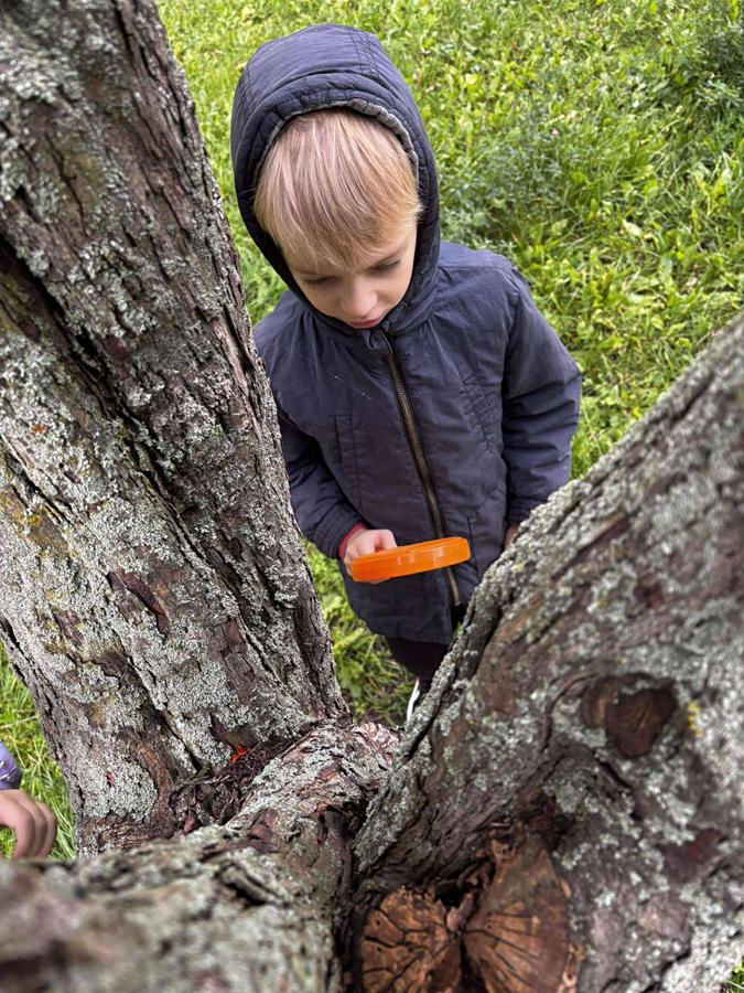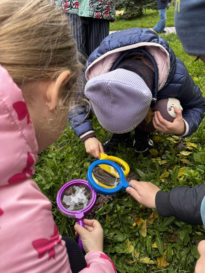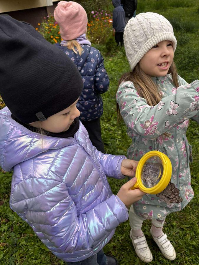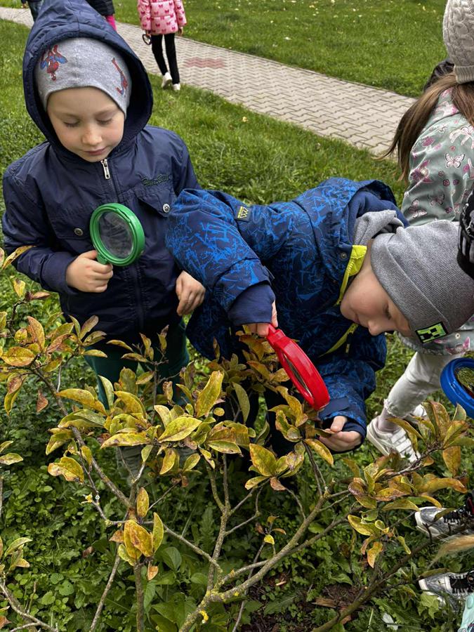 Uczniowie klasy I A wybrali się na zajęcia terenowe, podczas których prowadzili obserwacje przyrodnicze z wykorzystaniem lup. Dzieci z dużym zainteresowaniem przyglądały się roślinom, owadom i innym elementom otaczającej przyrody. Dzięki lupom mogły dostrzec wiele szczegółów, których na co dzień nie widać gołym okiem. Podczas wspólnej wyprawy uczniowie dokonali także ciekawego odkrycia – znaleźli wyjątkowy kamień w podróży, który wzbudził ich ogromną ciekawość. Stał się on pretekstem do rozmowy o tym, jak różnorodna i fascynująca potrafi być natura.