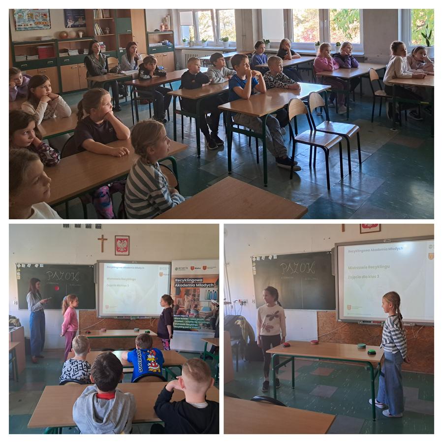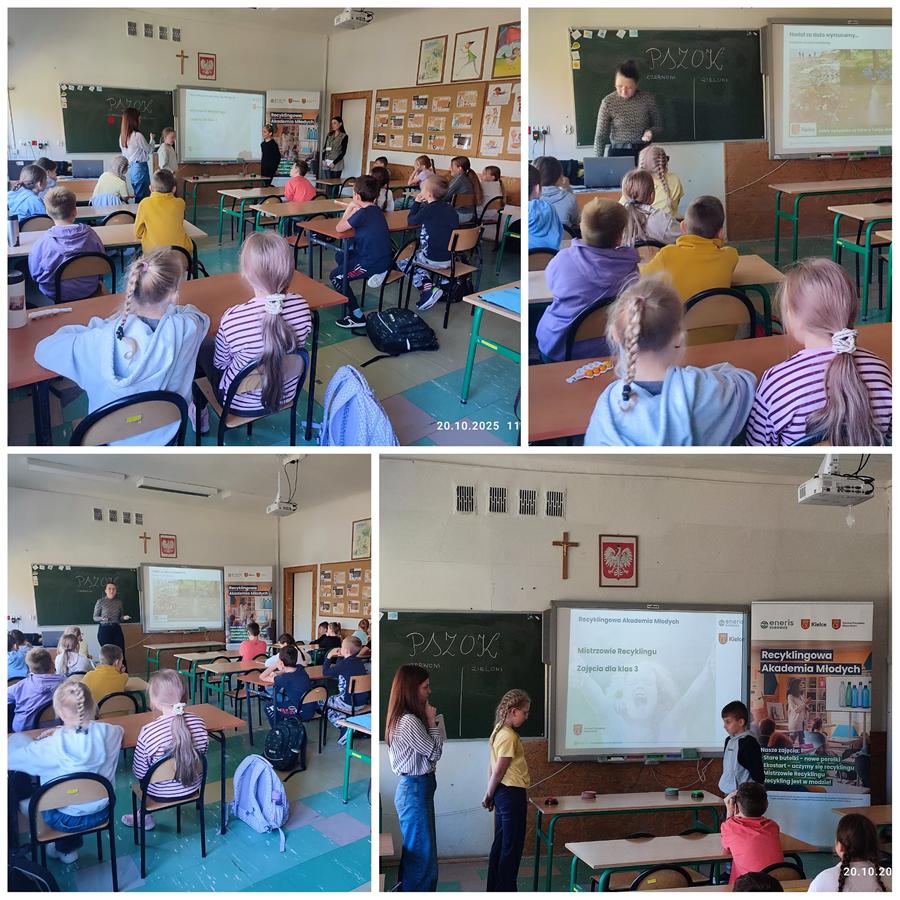 W dniu 20 października2025r.odbyły się zajęcia edukacyjne pod nazwą „Mistrzowie Recyklingu” w ramach programu Recyklingowa Akademia Młodych, realizowanego przez Firmę Eneris Surowce Kielce wraz z Wydziałem Klimatu, Środowiska i Gospodarki Komunalnej UM Kielce. Wzięli w nich udział nasi trzecioklasiści.