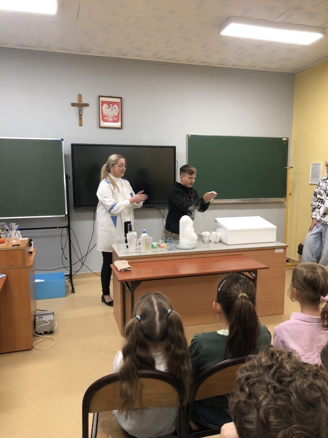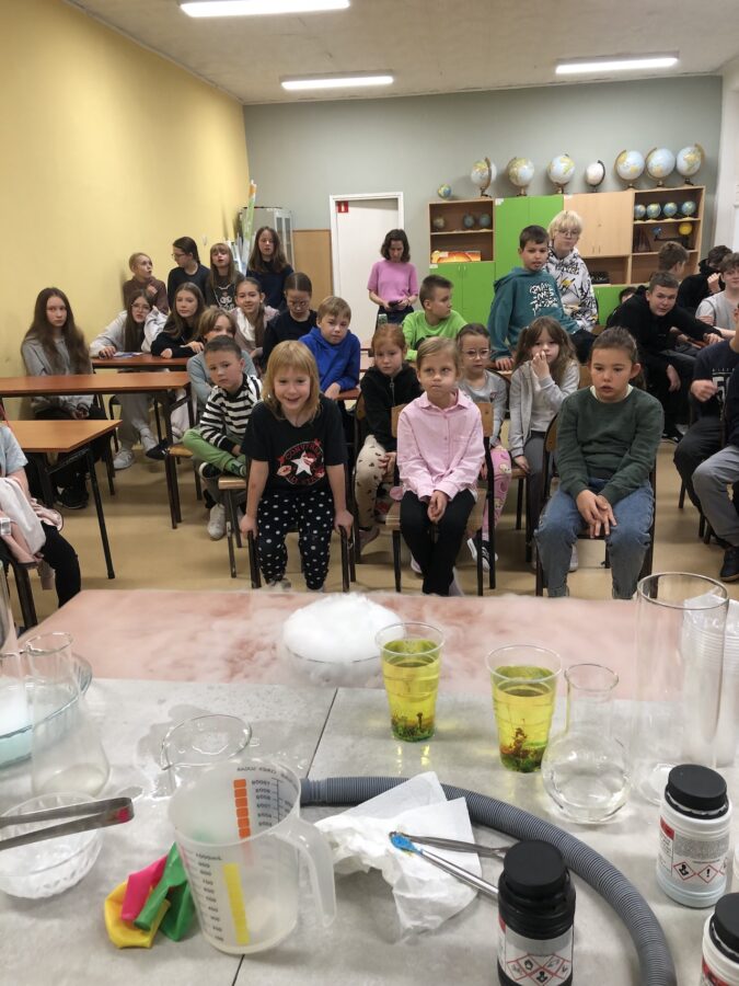 W dniu 24 października, odbył się pokaz doświadczeń z chemii i fizyki. W widowisku wzięli udział: Pani Dyrektor Beata Rozpara, Pani Wicedyrektor Marta Więckowska, nauczyciele, uczniowie naszej szkoły oraz grupa świetliczaków. Doświadczenia dla dzieci rozwijają wyobraźnię, kreatywność i umiejętność logicznego myślenia, pomagając im zrozumieć, jak działa świat. Uczą też wnioskowania, obserwacji i rozwiazywania problemów, wzmacniając ciekawość świata. Tematy pokazów były różnorodne, ale wszystkie kolorowe i zaskakujące. Uczniowie mogli zobaczyć doświadczenia chemiczne z użyciem suchego lodu. Z fizyki pokazy dotyczyły optyki, magnetyzmu, prądu elektrycznego i elektrostatyki.