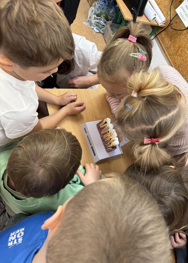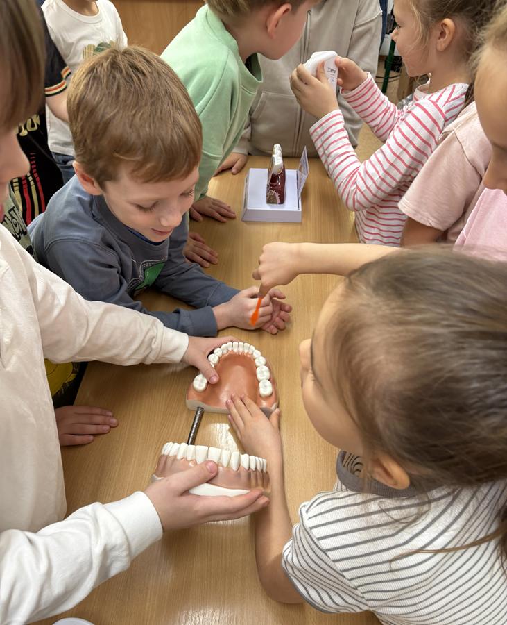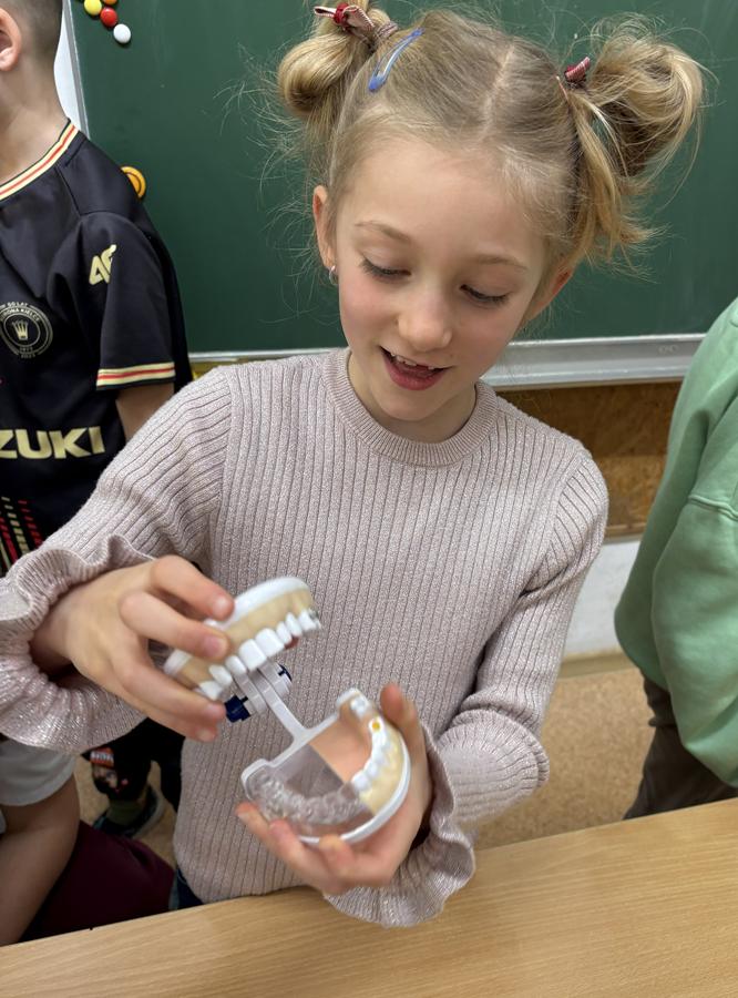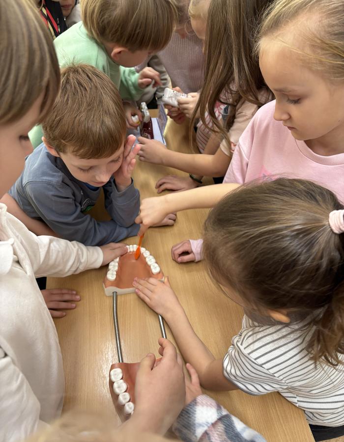 Dużym zainteresowaniem cieszyła się część poświęcona zasadom prawidłowej pielęgnacji zębów. Pani doktor wyjaśniła, jak właściwie szczotkować zęby, jak długo powinno trwać mycie oraz dlaczego warto używać nici dentystycznej. Uczniowie poznali również wpływ zdrowej diety na kondycję zębów i dowiedzieli się, że ograniczenie słodyczy oraz gazowanych napojów ma ogromne znaczenie dla zdrowia jamy ustnej.