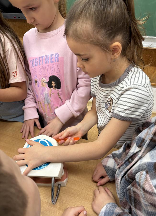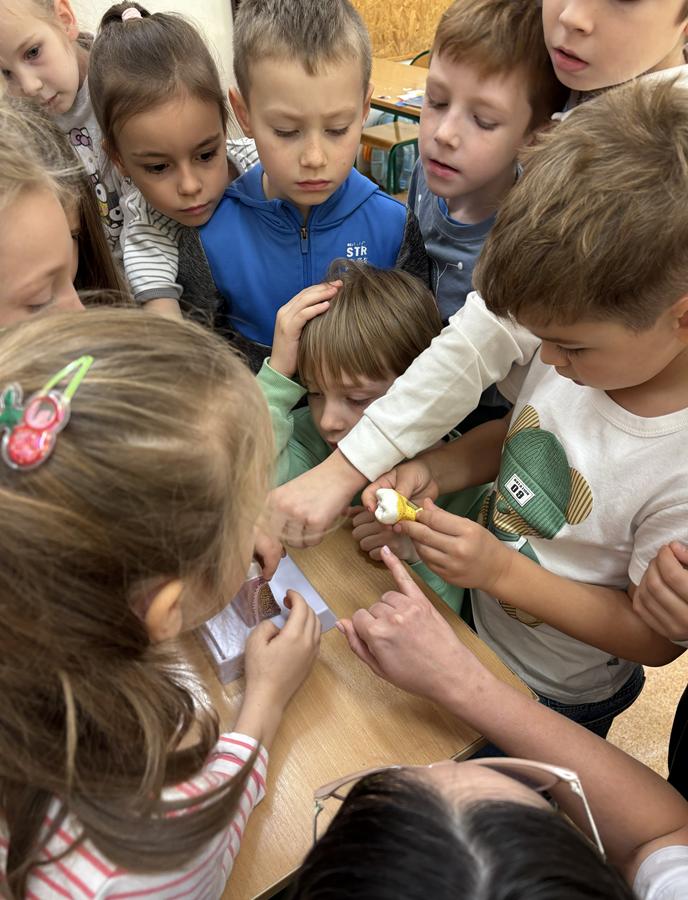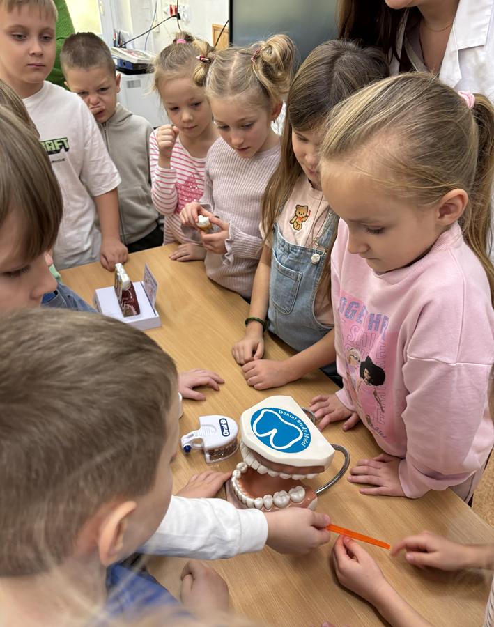 Pani doktor opowiedziała uczniom o codziennych obowiązkach stomatologa. Dzieci dowiedziały się, że dentysta nie tylko leczy zęby, ale także pomaga zapobiegać chorobom, doradza, jak dbać o higienę jamy ustnej, a czasem także wspiera pacjentów w przezwyciężaniu lęku przed wizytą.