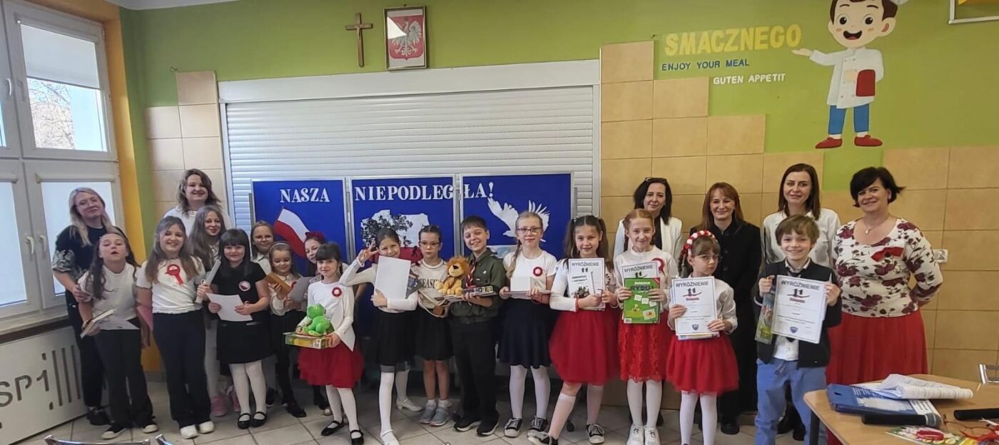 Dzięki p. Marii Litwinek odpowiedzialnej za przygotowanie muzyczne wszystkie nuty i głosy idealnie współgrały z melodią, tworząc harmonijną i wzruszającą całość. Wydarzenie dopełniła piękna oprawa artystyczna. Chorągiewki na występ uczniowie wykonali podczas zajęć plastycznych pod kierunkiem p. Agnieszki Karbownik, natomiast scenografię przygotowała p. Małgorzata Wojciechowska. Za przygotowanie recytatorów odpowiadała p. Anna Borowska, która pomagała uczniom w interpretacji poezji i pracy nad dykcją. Kierownik świetlicy – p. Klaudia Gola zatroszczyła się o upominki do dyplomów, zdjęcia i montaż filmiku.