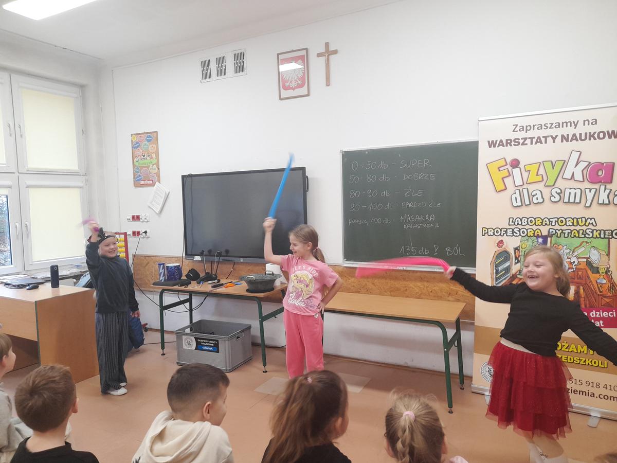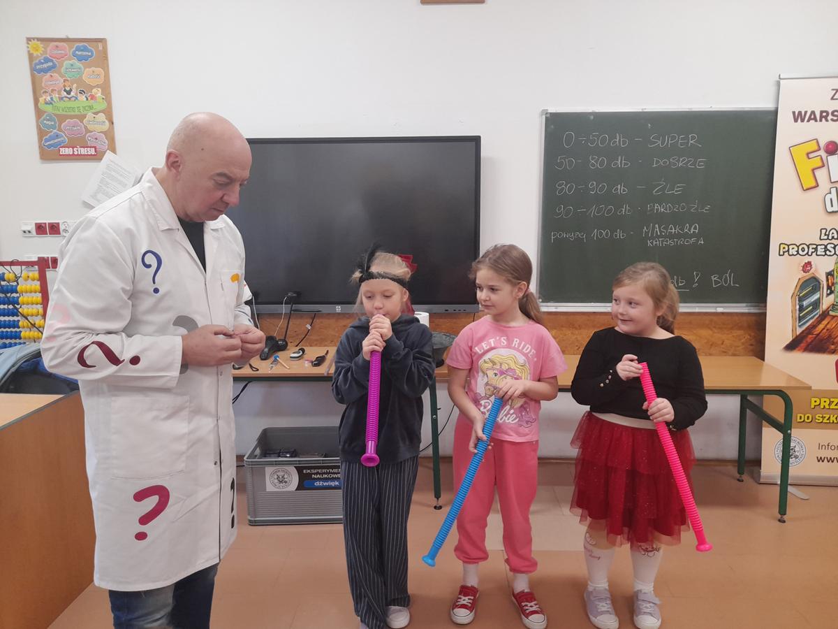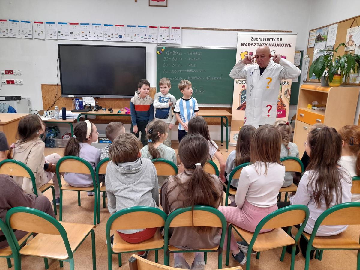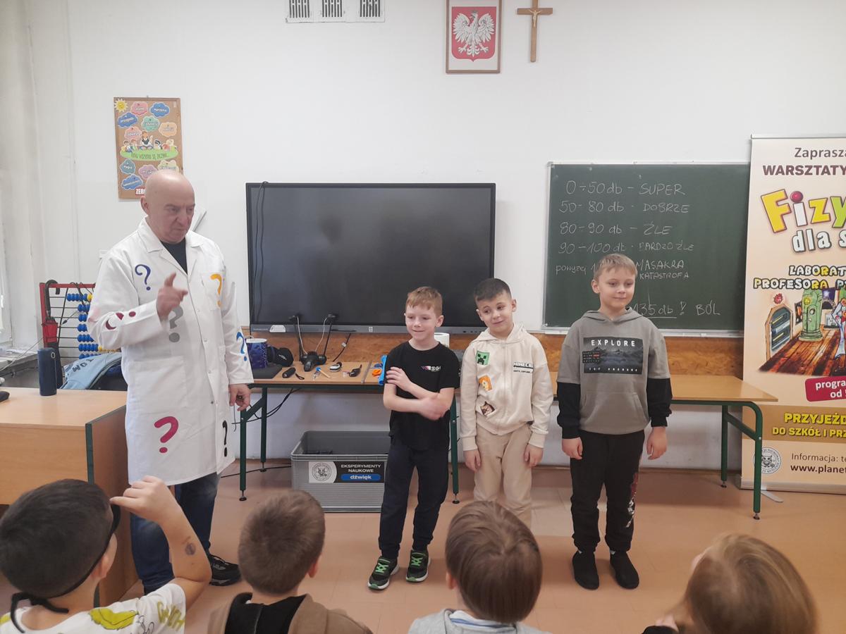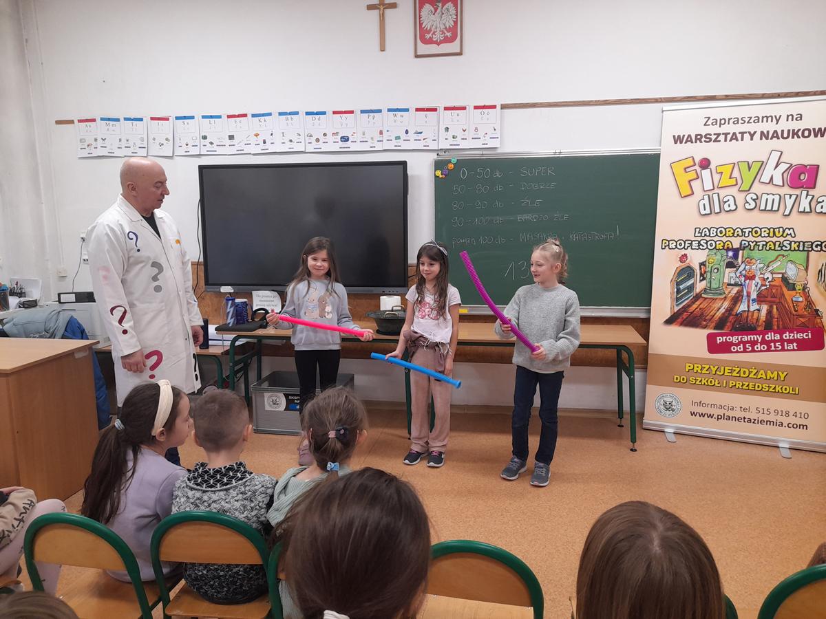 W klasach I–III odbyły się wyjątkowe zajęcia z cyklu „Fizyka dla Smyka”, prowadzone przez Profesora Pytalskiego. Tematem spotkania były nietypowe i nie zawsze przyjemne dźwięki, czyli piski, wrzaski i trzaski, które towarzyszą nam w codziennym życiu.