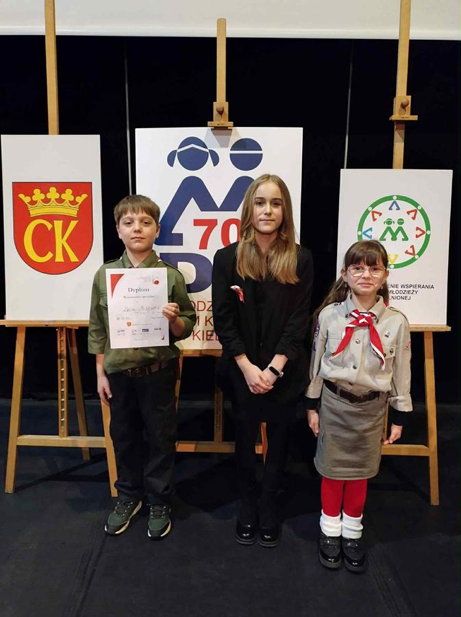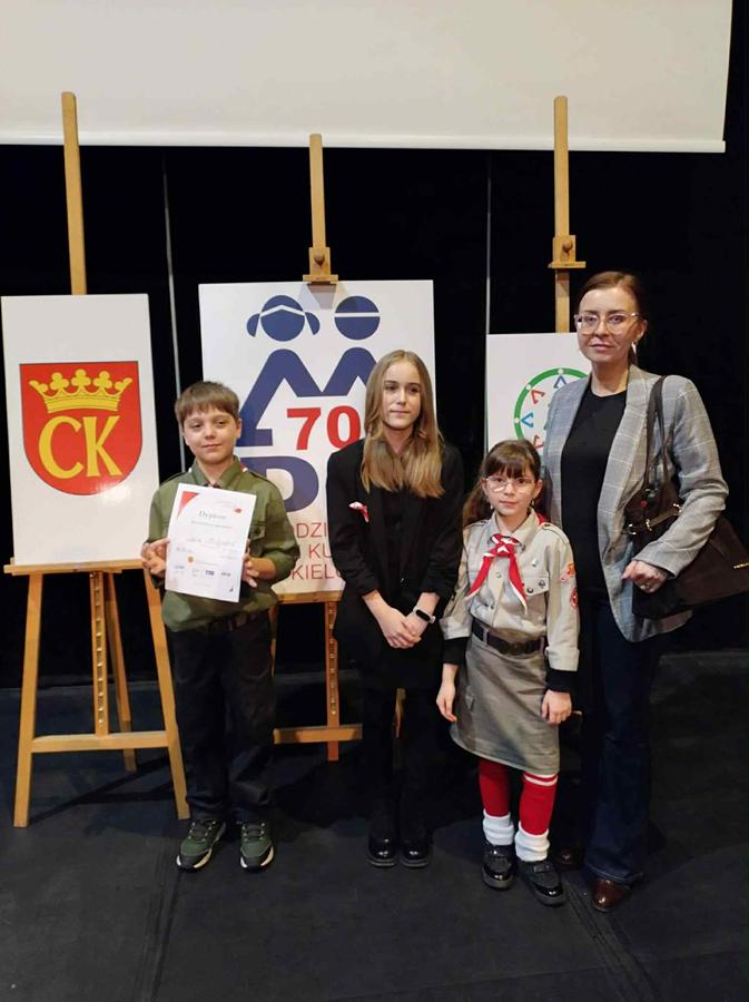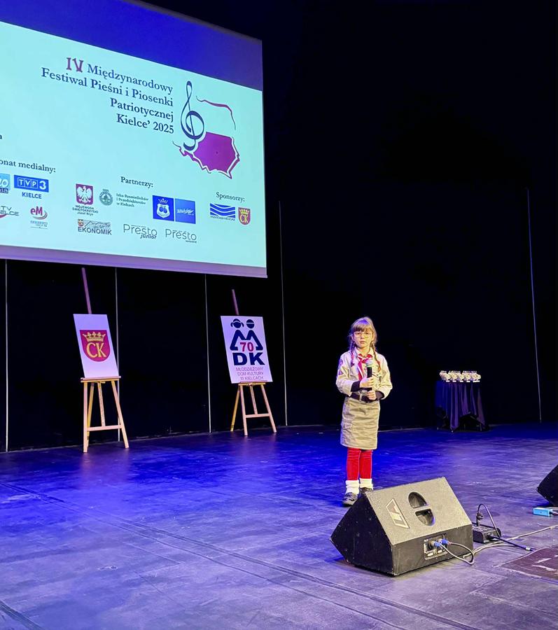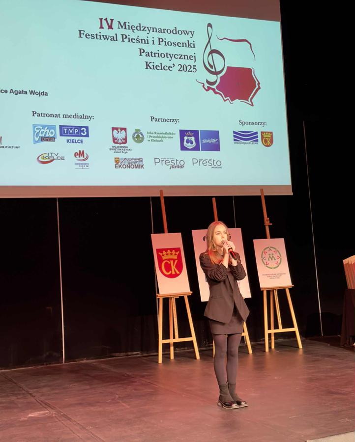 29 listopada 2025 r. na Małej Scenie Kieleckiego Centrum Kultury odbył się IV Międzynarodowy Festiwal Pieśni i Piosenki Patriotycznej zorganizowany przez Młodzieżowy Dom Kultury w Kielcach. Podczas festiwalu można było usłyszeć ponad 100 najbardziej uzdolnionych muzycznie dzieci, młodzieży oraz dorosłych z całej Polski. Z ogromną dumą pragniemy poinformować, że również troje uczniów z naszej szkoły wzięło udział w tym konkursie zdobywając wyróżnienia specjalne.