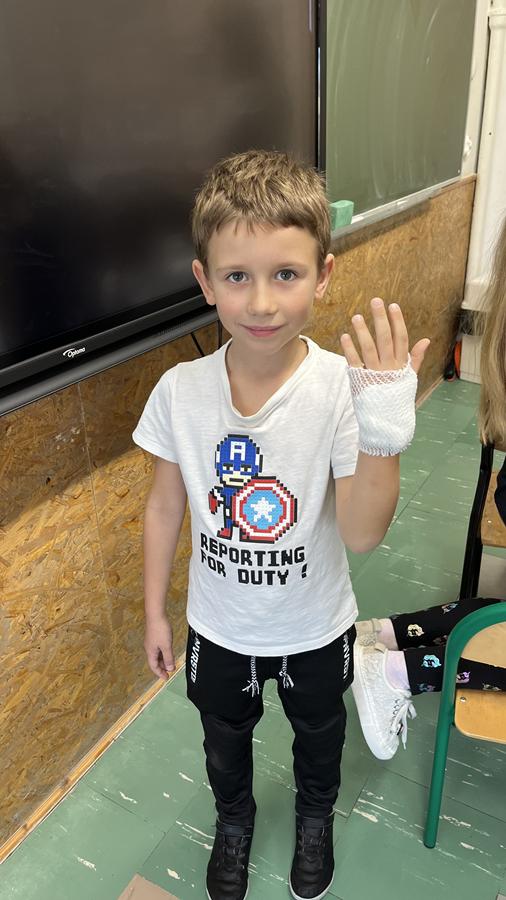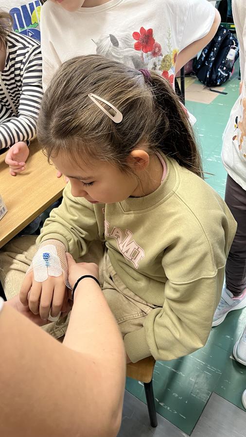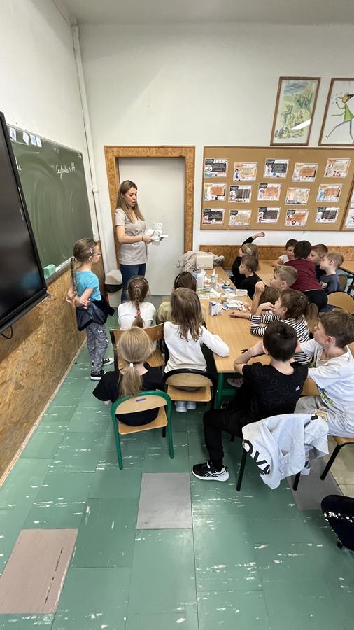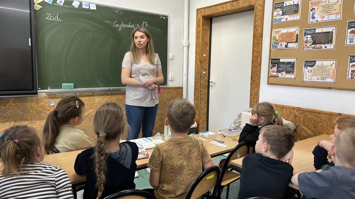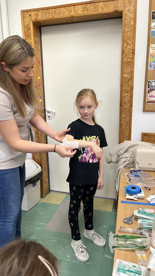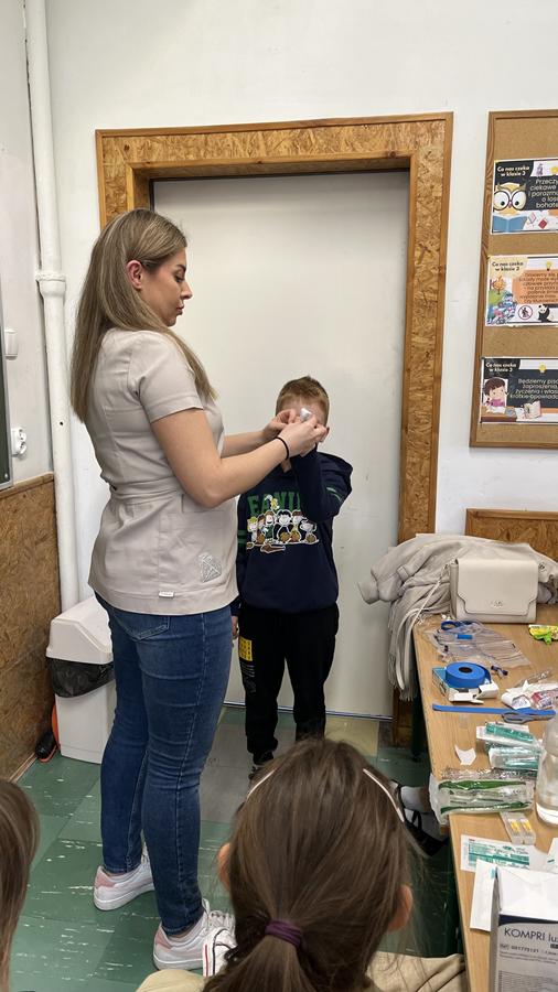Pani Karolina zaprezentowała także różne przybory i materiały medyczne wykorzystywane w codziennej pracy pielęgniarki, co wzbudziło duże zainteresowanie dzieci. Uczniowie mieli okazję z bliska obejrzeć m.in. środki opatrunkowe, strzykawki czy elementy zestawu do zakładania wenflonu, a także dowiedzieć się, jak jest on zbudowany i w jakich sytuacjach się go stosuje.