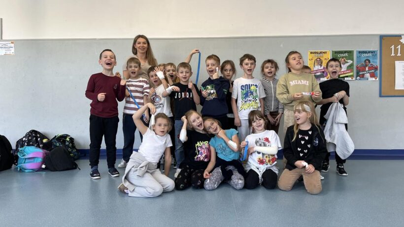 Pani Karolina zaprezentowała także różne przybory i materiały medyczne wykorzystywane w codziennej pracy pielęgniarki, co wzbudziło duże zainteresowanie dzieci. Uczniowie mieli okazję z bliska obejrzeć m.in. środki opatrunkowe, strzykawki czy elementy zestawu do zakładania wenflonu, a także dowiedzieć się, jak jest on zbudowany i w jakich sytuacjach się go stosuje.