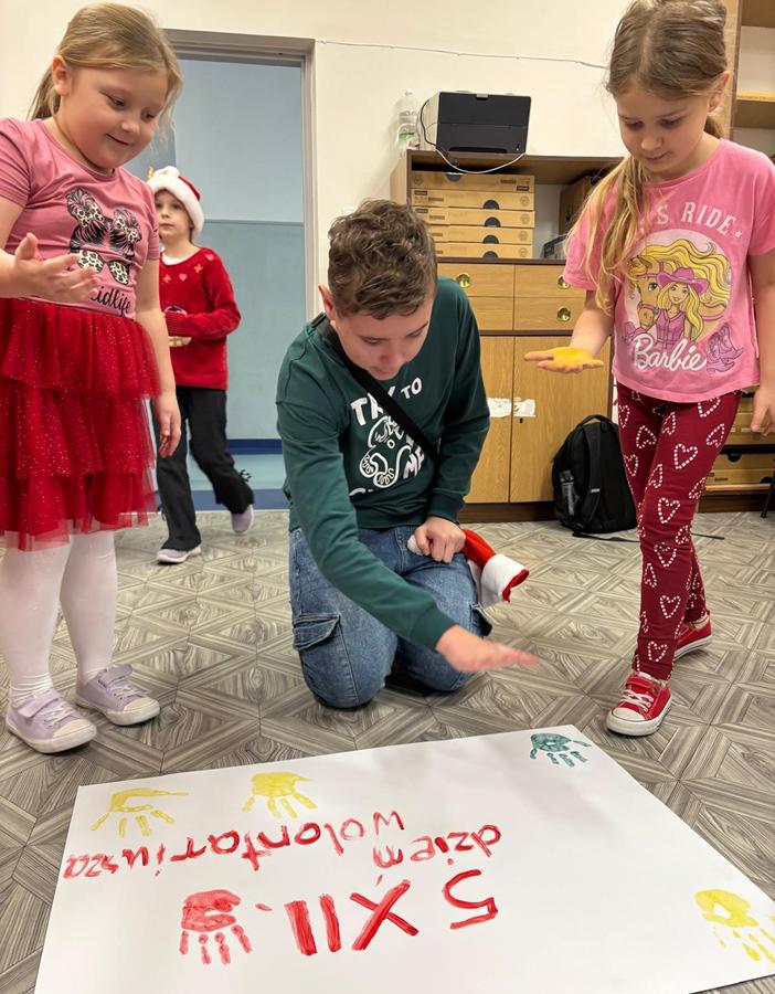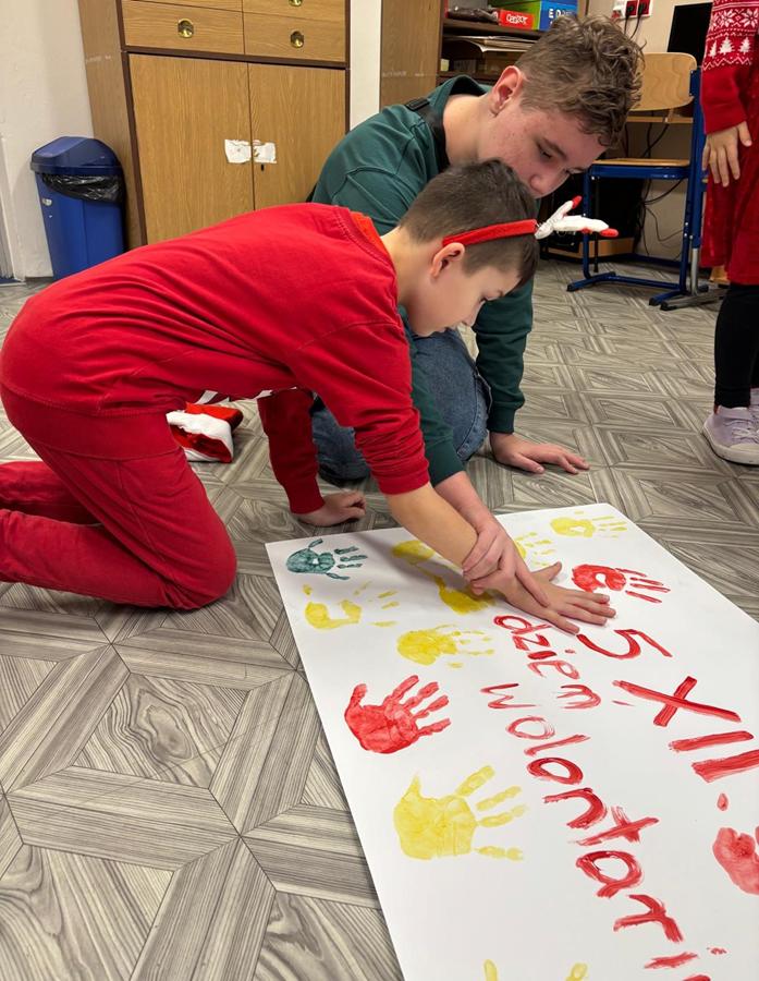 Dzieci z zainteresowaniem słuchały przykładów działań podejmowanych przez starszych kolegów – od akcji charytatywnych, przez wspieranie schronisk dla zwierząt, aż po inicjatywy szkolne. Po rozmowie wszyscy wspólnie stworzyli duży, kolorowy plakat. Podczas pracy panowała miła, twórcza atmosfera, a uczniowie chętnie dzielili się pomysłami.