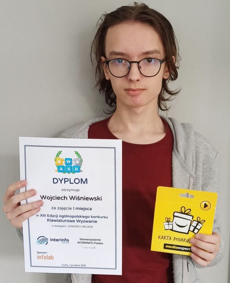 Indywidualnie rewelacyjnie spisał się Wojciech Wiśniewski, który spośród kilkuset uczniów z całej Polski okazał się najlepszy i zajął I miejsce. W nagrodę, oprócz dyplomu otrzymał kartę podarunkową do sklepów Media Expert o wartości 250 PLN.