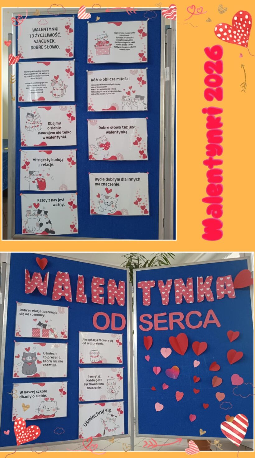 Miłe wsparcie otrzymaliśmy również od nauczycieli specjalistów. Przygotowana przez nich gazetka, umieszczona przy wejściu do szkoły, pokazywała, że walentynki, to także życzliwość, szacunek i empatia – wartości, o których warto pamiętać każdego dnia!