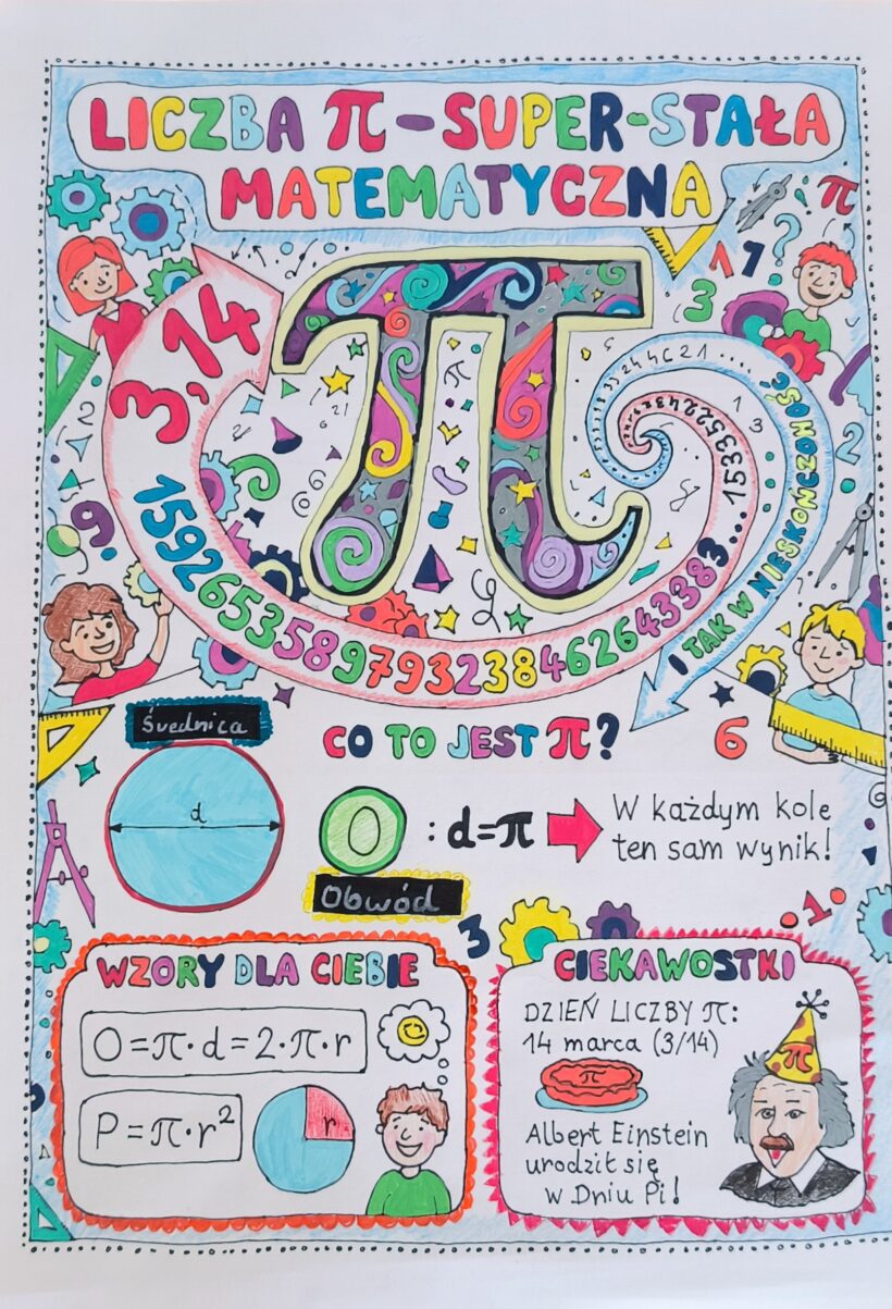Dzień liczby Pi tradycyjnie przypada 14 marca. Dlaczego taka data? Wybrano ją z powodu skojarzenia z pierwszymi cyframi rozszerzenia dziesiętnego liczby Pi, jako że data „14 marca” zapisywana jest w USA jako „3.14”. Na zajęciach nauczyciele matematyki przybliżyli klasom tą matematyczną stałą. Ponadto chętni uczniowie klas 4-8 przygotowali plakaty zawierające ciekawostki dotyczące tej niezwykłej liczby. Zaglądając do galerii zobaczycie próbkę ich możliwości.