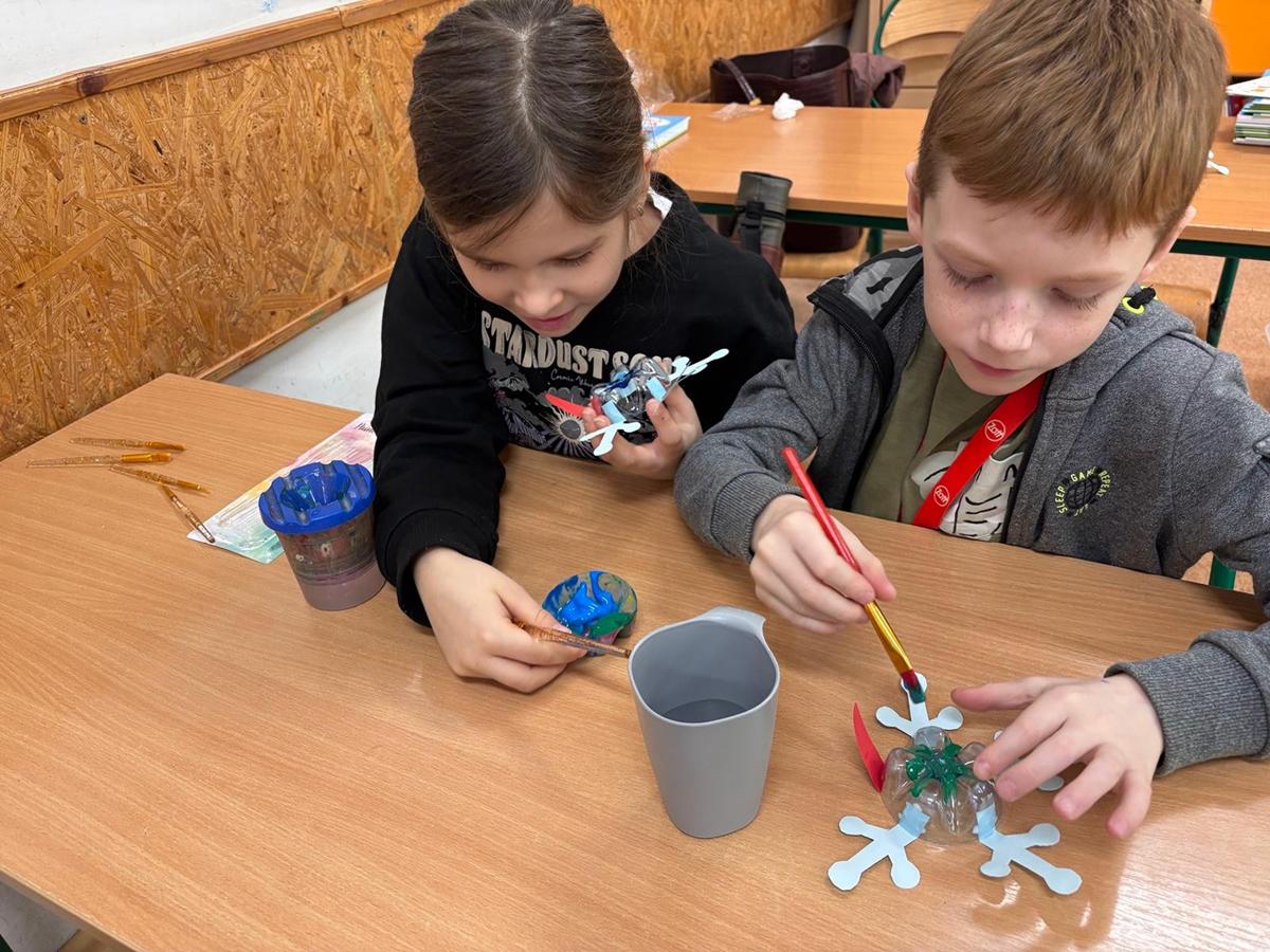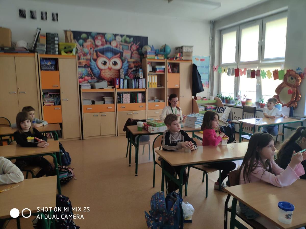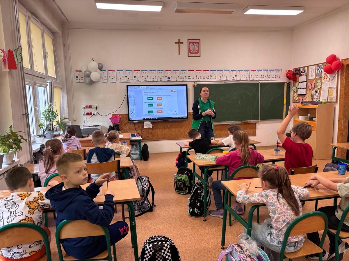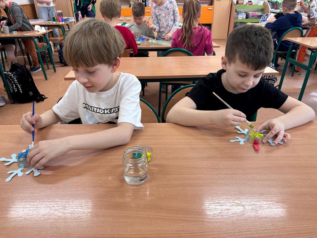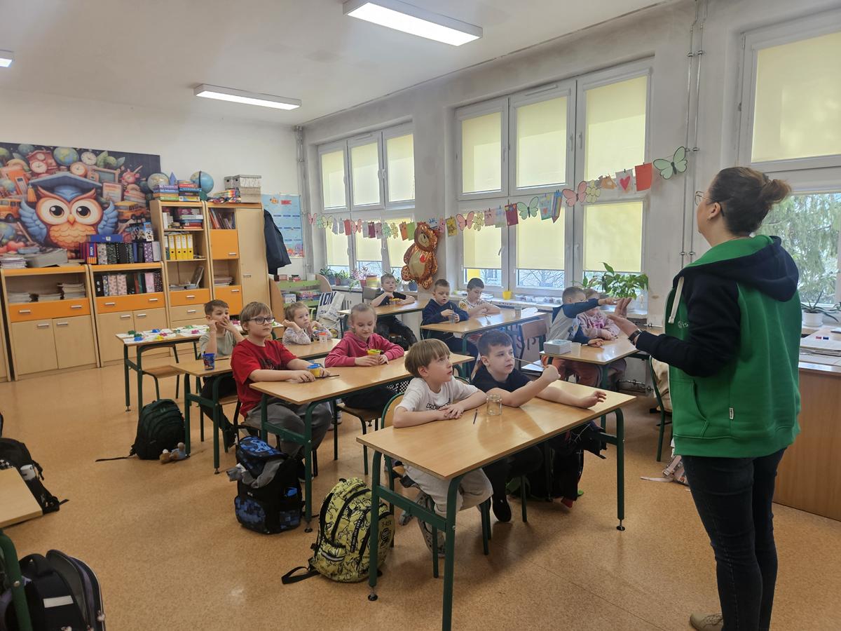 Po części teoretycznej uczniowie przystąpili do zajęć praktycznych. Wykonali żabę z materiałów recyklingowych, rozwijając przy tym swoją kreatywność i zdolności manualne. Na zakończenie każde dziecko otrzymało książeczkę dotyczącą zasad segregacji śmieci.