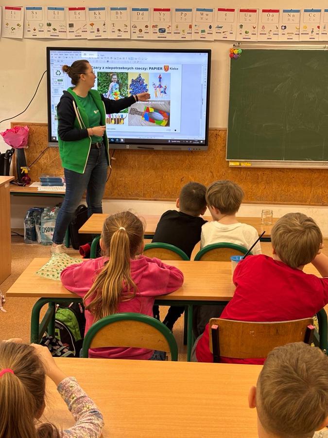 Uczniowie klas pierwszych wzięli udział w zajęciach edukacyjnych pt. „Ekostart – uczymy się recyklingu”, które były prowadzone przez Panią Aleksandrę Wołowiec z firmy Eneris Surowce Kielce oraz Panią Martę Szymonek z Urzędu Miasta Kielce, Wydziału Klimatu, Środowiska i Gospodarki Komunalnej.